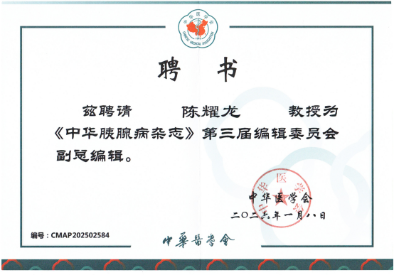 2026年1月,中华医学会正式聘任我中心主任陈耀龙教授作为《中华胰腺病杂志》第三届编辑委员会副总编辑。